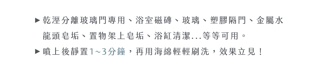 ●乾溼分離式玻璃門專用,、浴室磁磚、玻璃、塑膠隔門、金屬水龍頭皂垢、置物架上皂垢、浴缸清潔... ,跟皂垢說掰掰。