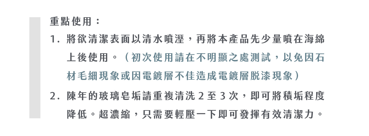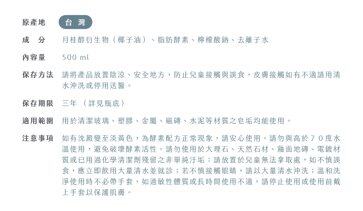 ●除垢髒污一次搞定、不傷材質、無腐蝕性,無添加防腐劑、有害化學成分。
