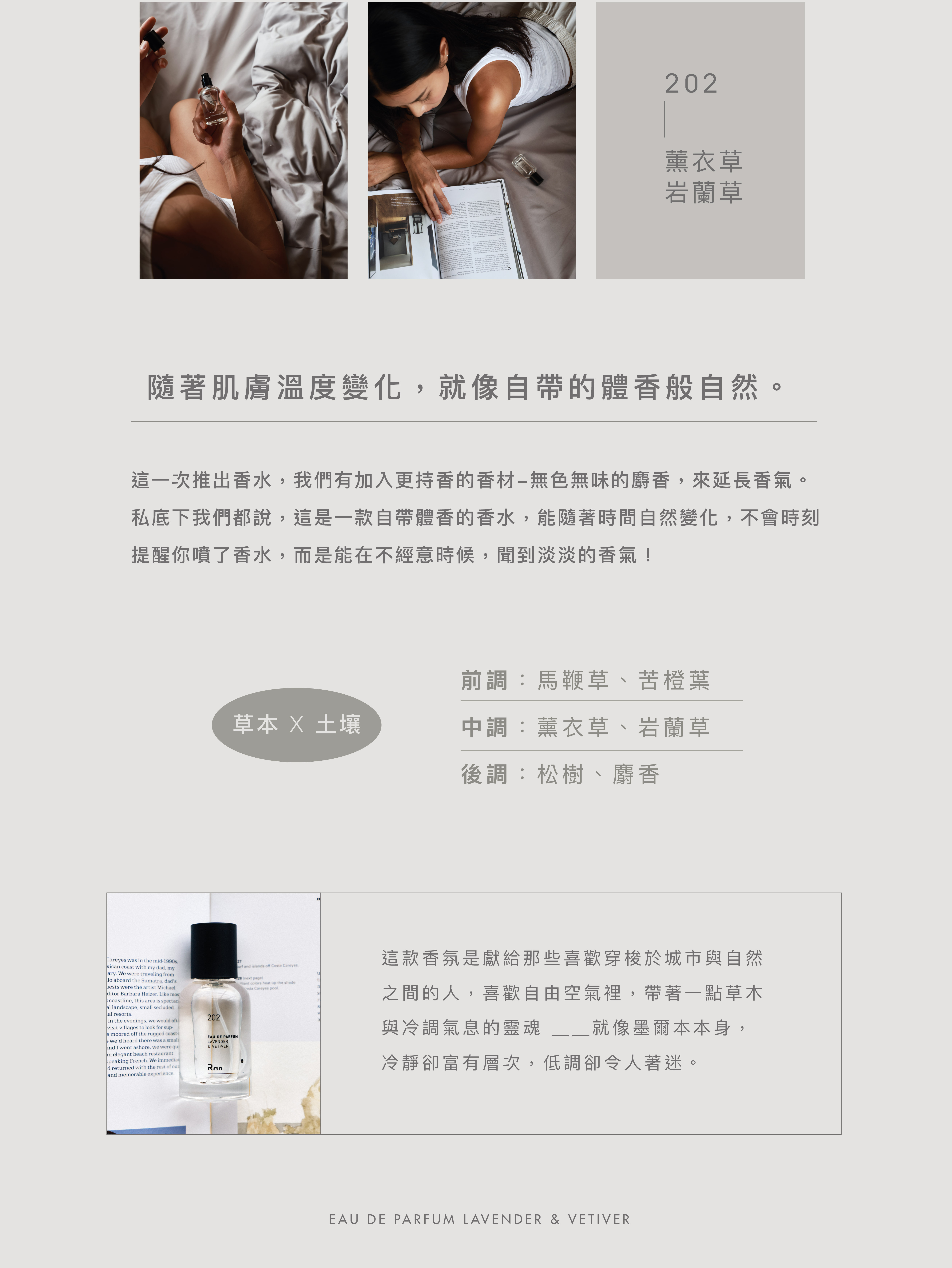 • 來自薰衣草根莖的草本香氣,與岩蘭草的溫潤泥土香交織伴隨松樹與麝香餘韻