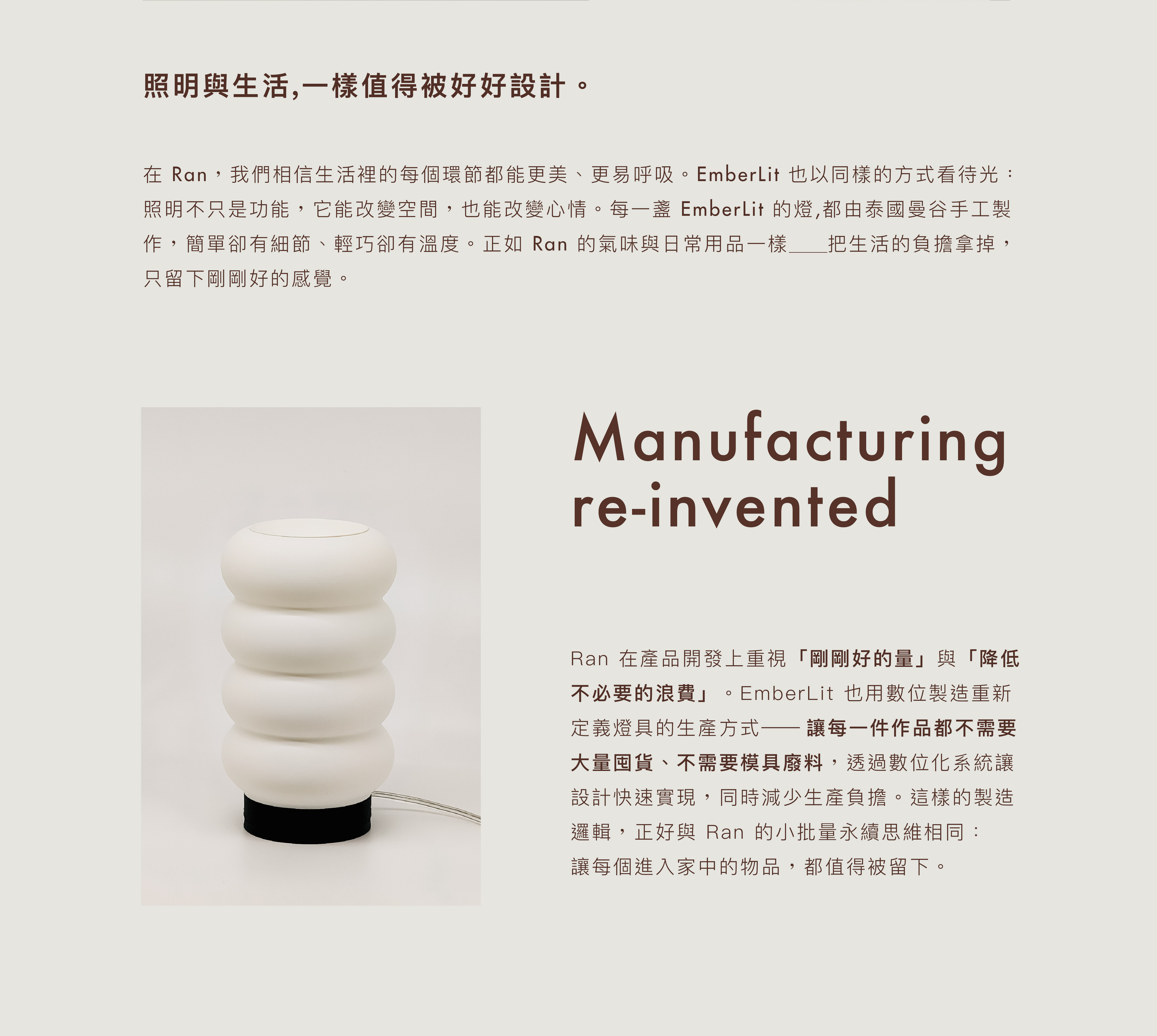 以小巧可愛的貝果曲線為靈感,桌上型貝果燈以更輕盈的尺寸呈現柔和光暈,剛好點亮桌面的一隅。無論放在書桌、床頭或窗邊,它都能為空間添上一圈暖光,營造療癒又不佔空間的日常氛圍。外型簡潔、易於擺放,是為居家角落增添質感的小型設計燈飾。